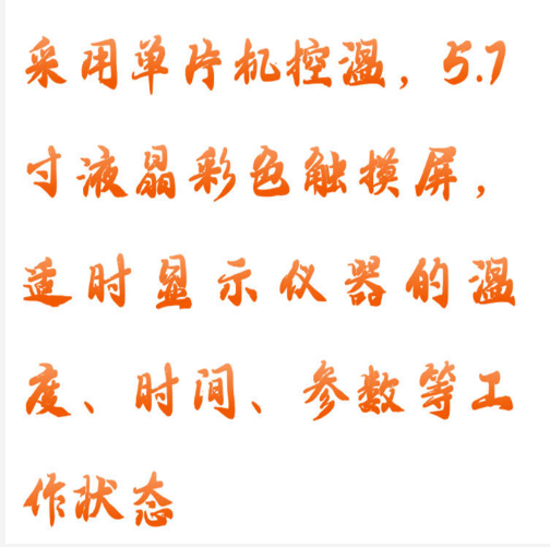 1.采用單片機(jī)控溫,5.7寸液晶彩色觸摸屏,適時顯示儀器的溫度、時間、參數(shù)等工作狀態(tài);